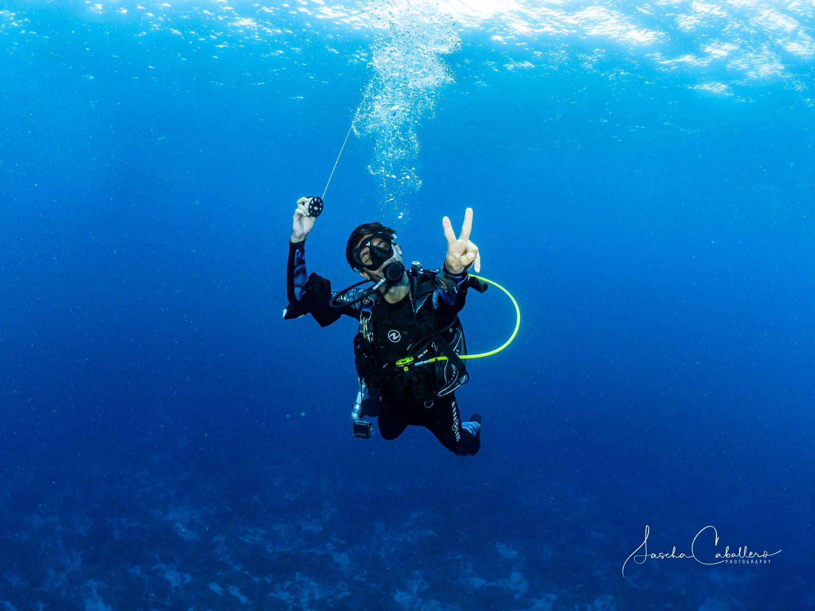 Begegnung mit einem Walhai – nach einem Sprung ins Wasser sahen wir den Gigant, wie dieser ruhig, majestätisch und an uns vorbei zog, bevor er im dunklen Blau verschwand.